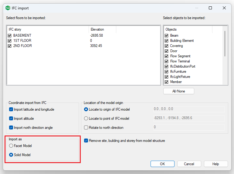 In addition, you can choose whether you want the IFC model to turn into a facet or solid model for your Vertex model in the import dialog.