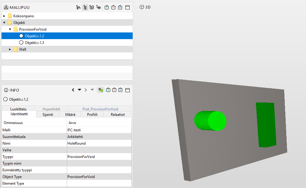 Parts named HoleRound and HoleRectangle in the assembly are now recognized as hole reservations and are exported to the IFC file. Their type is ProvisionForVoid in the IFC file. An IFC property set named Pset_ProvisionForVoid is automatically written to these, which contains information about the shape of the hole (round or rectangular), the ID (identity from the description field of the item data), the size of the hole (diameter or width x height from the dimensions field of the item data) and the depth of the hole (length the number of item data field). This feature is improved to version 28.0.02 as well. (Vertex ID: PLANT-3742)