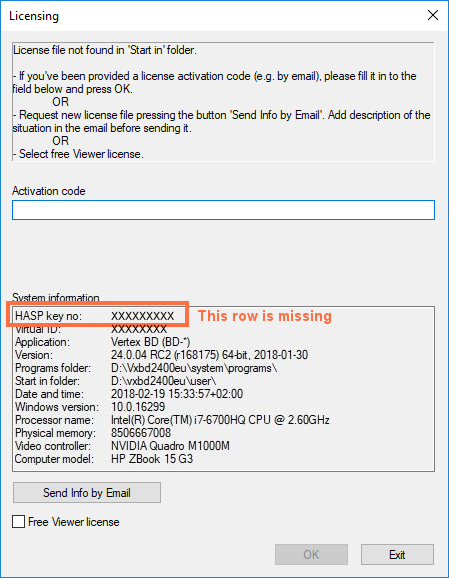 When you start the program, a window opens telling that a license file could not be found and asking for an activation code. The HASP module label is not shown in the system information, indicating a driver problem.