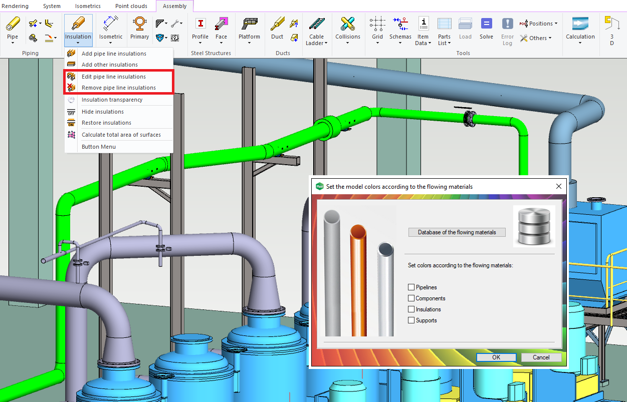 We have updated the old feature which allows you to set the pipeline's and related components' color according to the flowing material. Now you can also set the color for the insulation. We also adjusted the user interface. (Vertex ID: PLANT-3635)