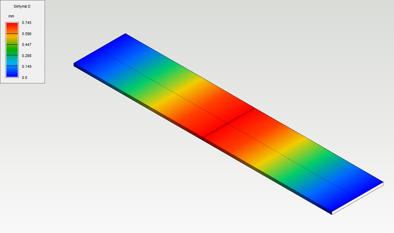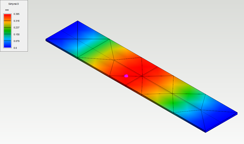 - Results with a bit more dense 10 node tetrahedron element mesh. There is only one solid element through the plate thickness. The maximum displacement is 6,5% smaller than in results with beam element.