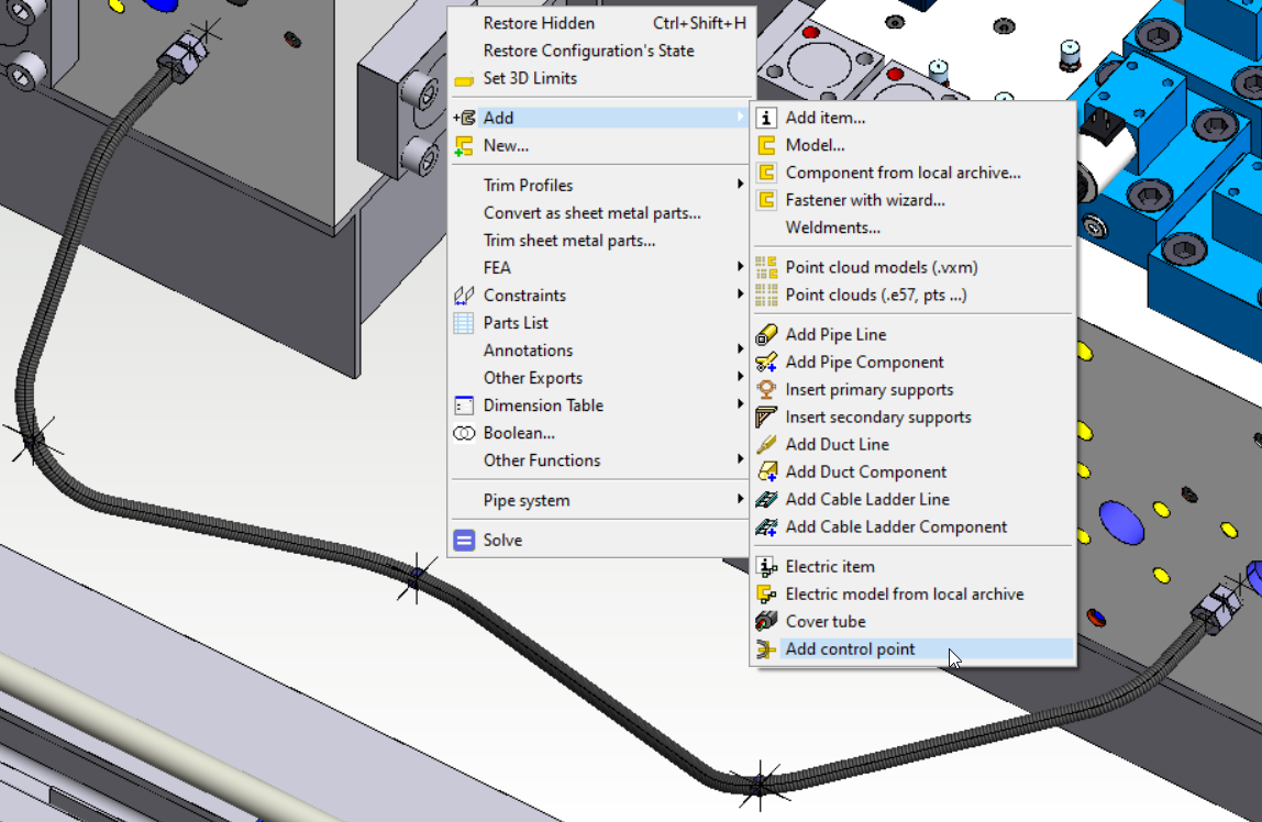 Version 28.0 now also has a separate Add Control Point feature that allows you to add separate control components to the hoses afterwards. The function can be found in the assembly from the context menu Add > Add control point. The control point gets a coincident mate with the hose center line. This also makes the route of the hose follow the positioning of the guide parts.