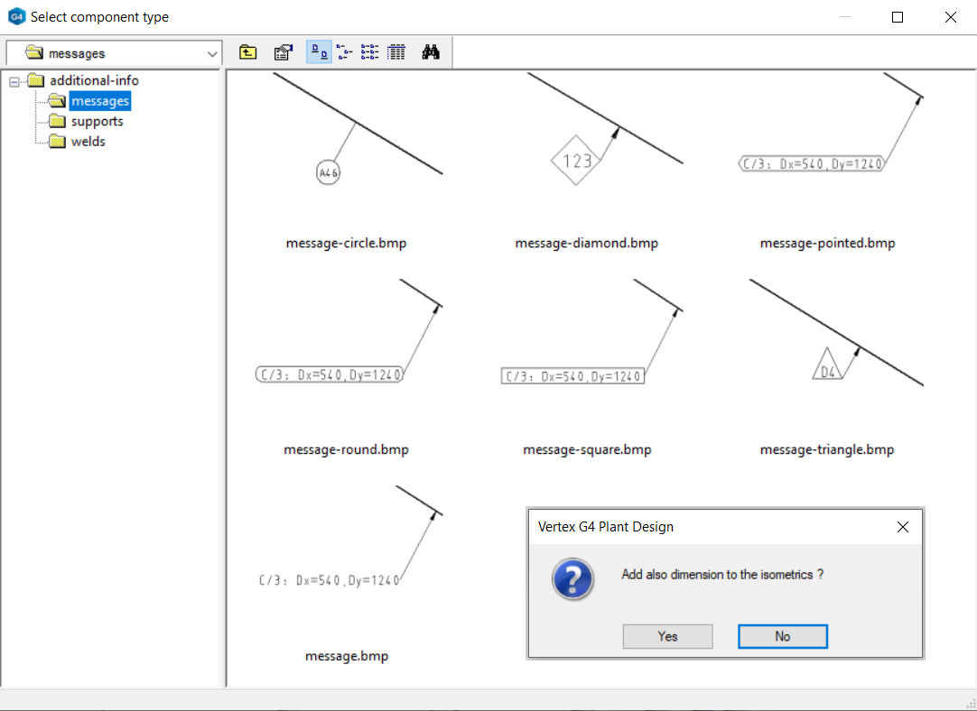 It's now possible to add dimensions for messages in the isometric drawings. The program asks do you wish to add the dimension for your special isometric message symbol. (PLANT-2357)