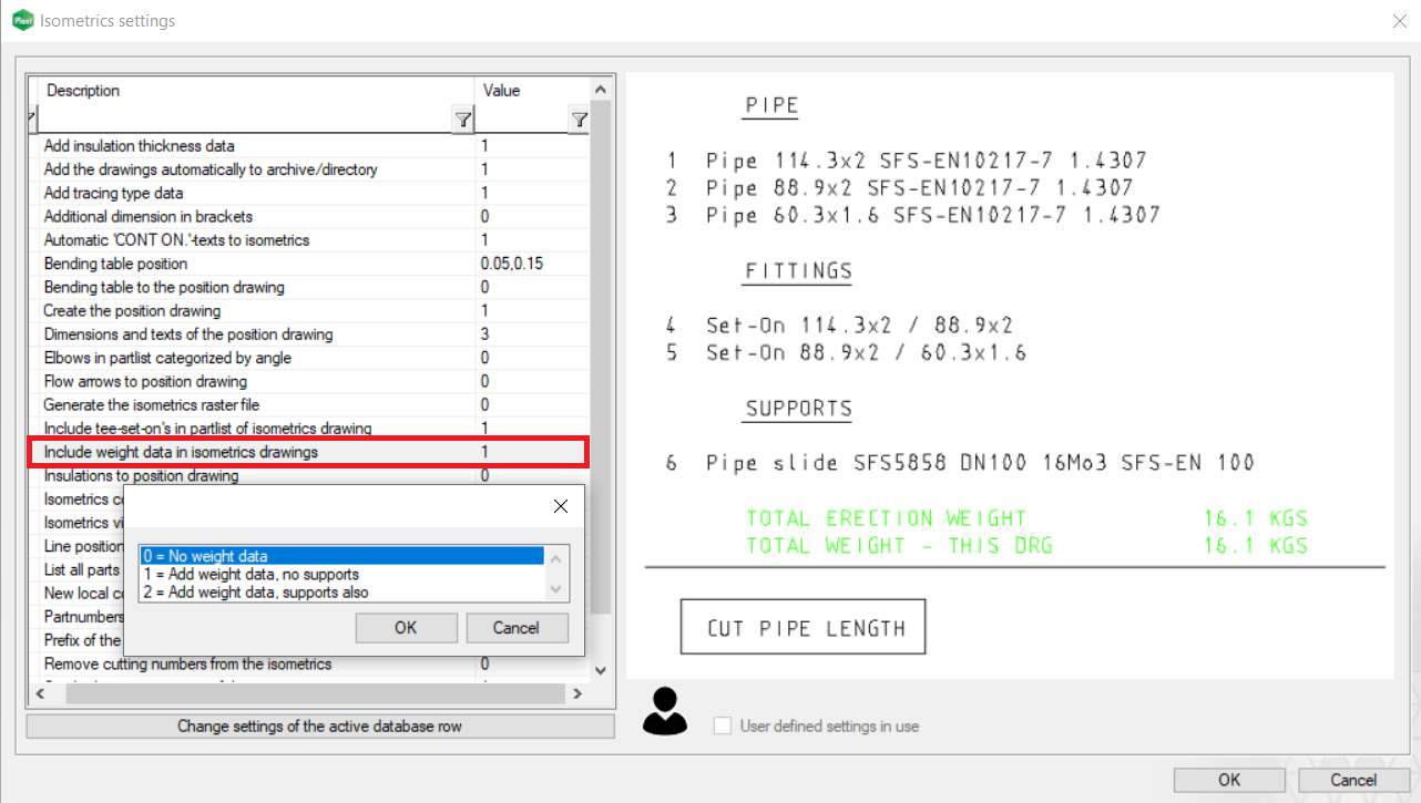 The program now adds the weight of the support and fasteners to the total weight of the isometric drawing. The program calculates the weight for the supports by using the geometry when you add them to your pipeline. Same happens with the fasteners when you add flanges to your pipeline. (PLANT-3817)