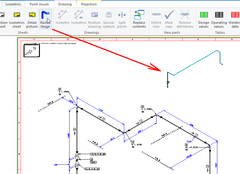 It is possible to add a raster image of the pipeline into the recently created isometric drawing. After the isometric drawing is created use the special command Raster Image to obtain the image of the pipeline. You can set the location and scale of the image.