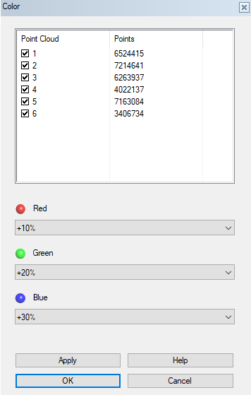 The function Color has a new dialog. You can find the function from the tab Point Clouds and the context-sensitive menu. Editing colors is based on changing the RGB values of point cloud colors in percentage like before. The user can browse through the clouds in the dialog and choose to which point clouds the color update affects. (Vertex ID: PLANT-4364)