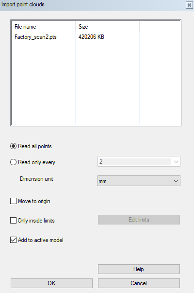 We have simplified and clarified the importing process of the point clouds. There is now only one function Import point cloud which handles all imports. The drag and drop method is still available as well. All conversions use the same revised dialog Import point clouds (see the picture below). This import function is available with and without an active model. The check-box Add to active model is enabled by default when adding point clouds to the active model.