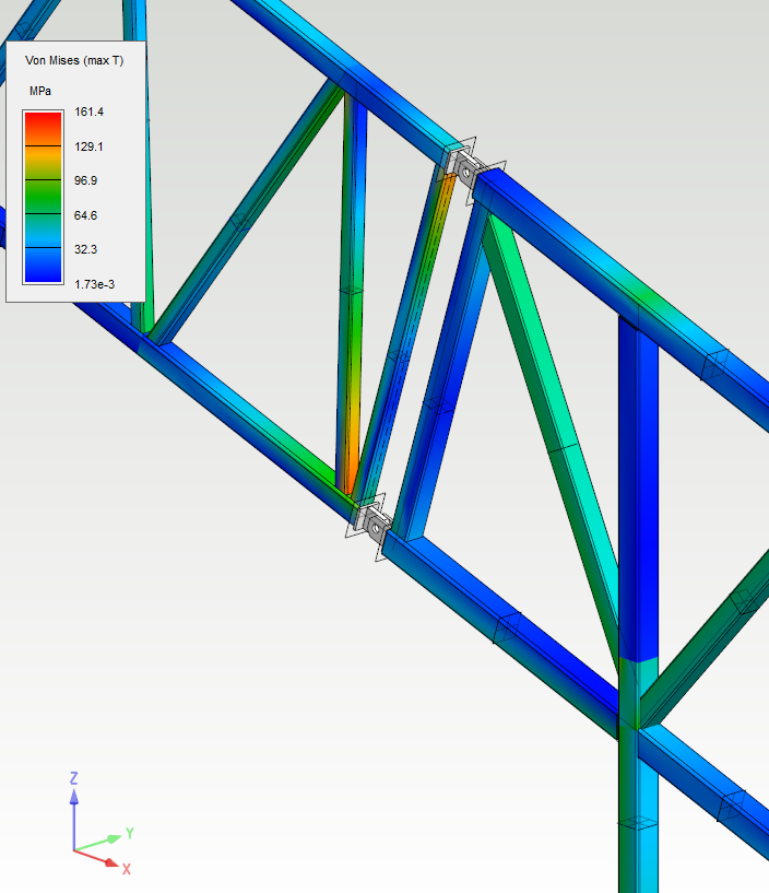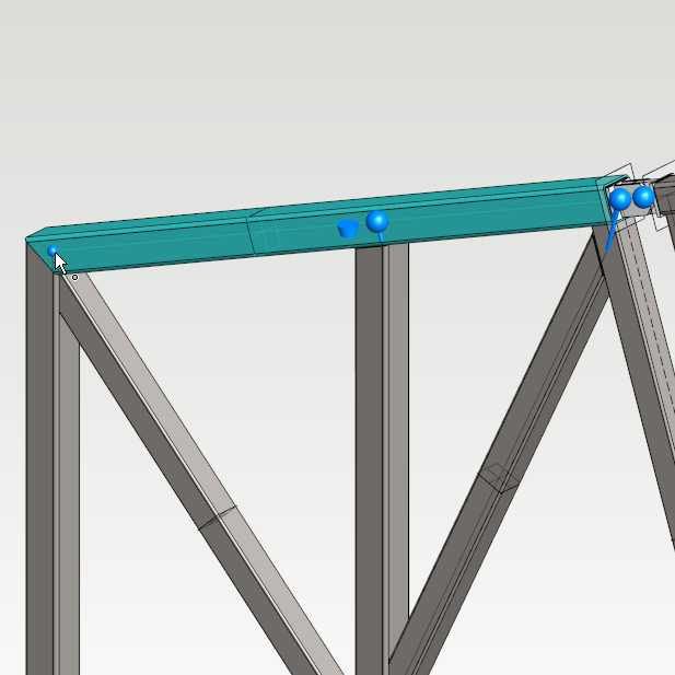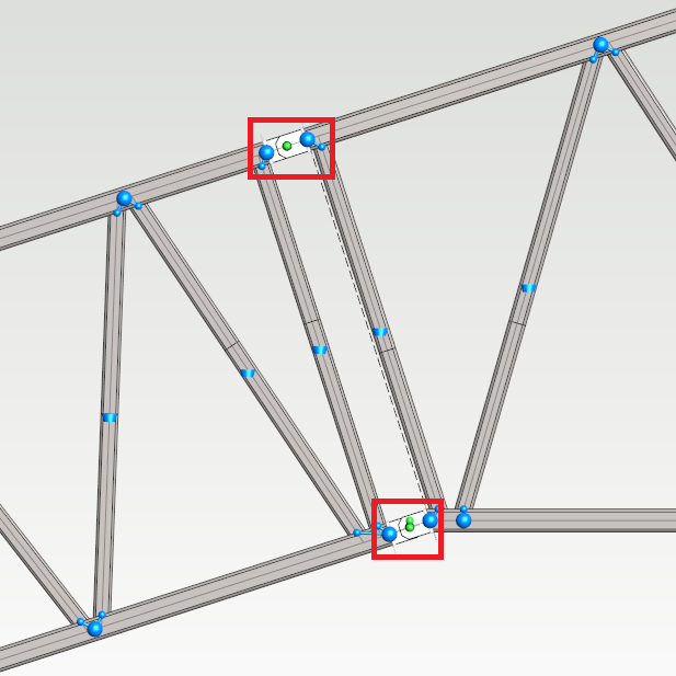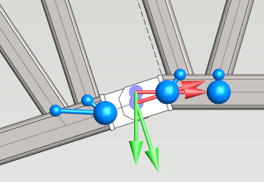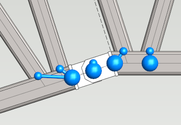 The profiles of frame are now linked. The joint parts of model are not included in the study because they are not valid sources for beam elements. Let's assume that the joint parts have same mechanical behaviour as top chords of the frame. Extend the chords in the analysis model by adding extra elements to them. Select a chord and press Insert node from contextual tab. Add node to the extension of chord under the point where joint part's axis of rotation is located.