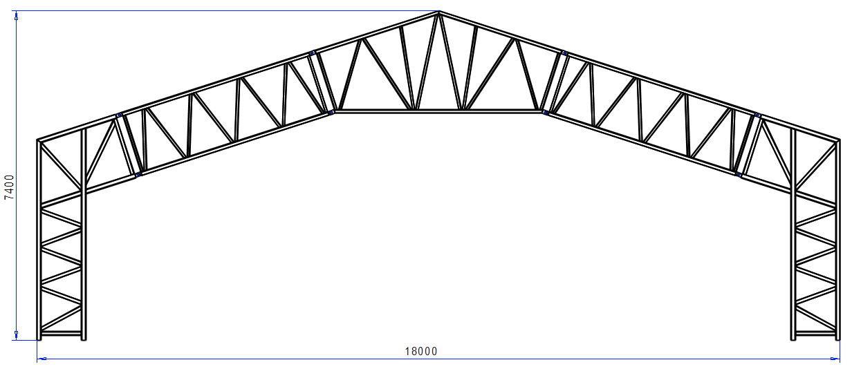 This example shows how to build a FEM analysis model for a portal frame illustrated in the figure below. The bottom ends of columns will be fixed to the ground. The top chords of the frame are loaded with linear load. The self-weight of profiles is also taken into account.