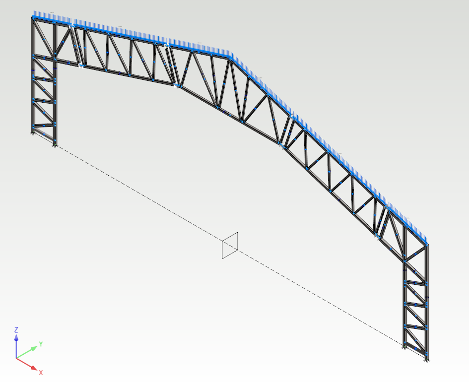Add linear loads to the other top chords of the frame in the same way as previous. In this example the values of linear loads are set to 8 kN/m in the negative Z direction of 3d model.