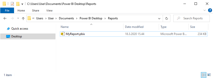After creating a report in Power BI Desktop, save the report in the native Power BI report file type, as a .pbix file.