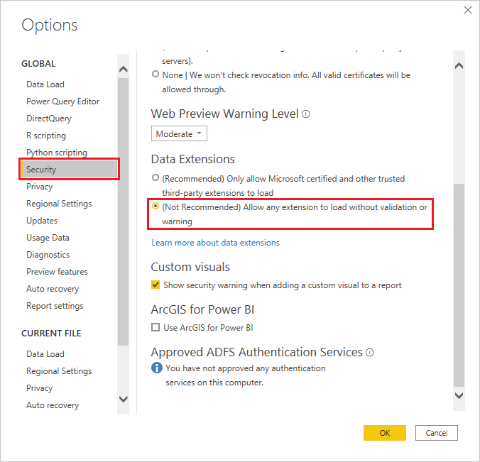 You can download and install the Power BI Desktop software for free from Microsoft's website or Microsoft Store. In order to install the Flow connector, locate the install directory for Power BI connectors, presumably located in the path C:\Users\<username>\Documents\Power BI Desktop\Custom Connectors. If the directory does not exist, create it. Download the file VertexFlowConnector.pqx from the link on the right and move it to the install directory Custom Connectors. The connector can be enabled in two ways related to the connector's certificate. See the options below: