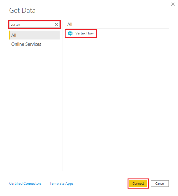 Find the Vertex Flow connector, for example by writing "vertex" in the search field. Choose Vertex Flow and select Connect.