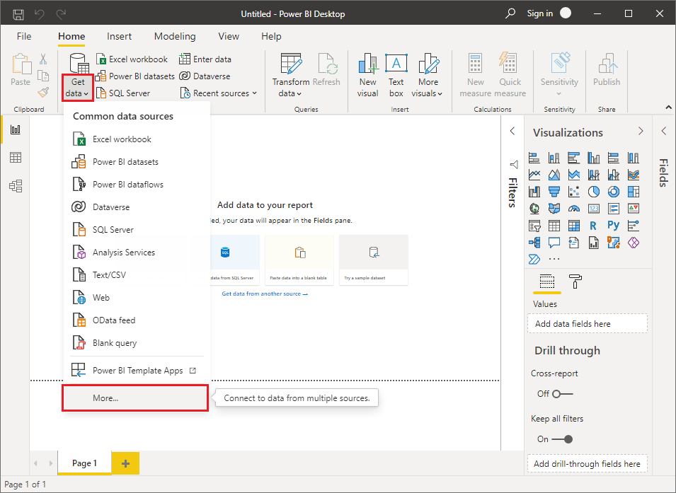 In Power BI, go to the Home tab in the ribbon and in the Data group, choose Get data and then More....