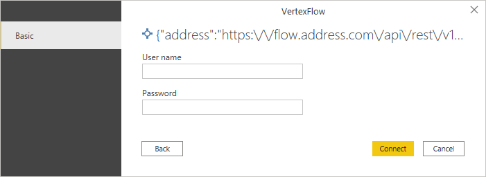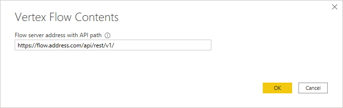 In the text field, write the address of the Flow server from which you want to get data. With Power BI's Vertex Flow connector you can direct your data queries to different Flow servers by changing the address in this field.