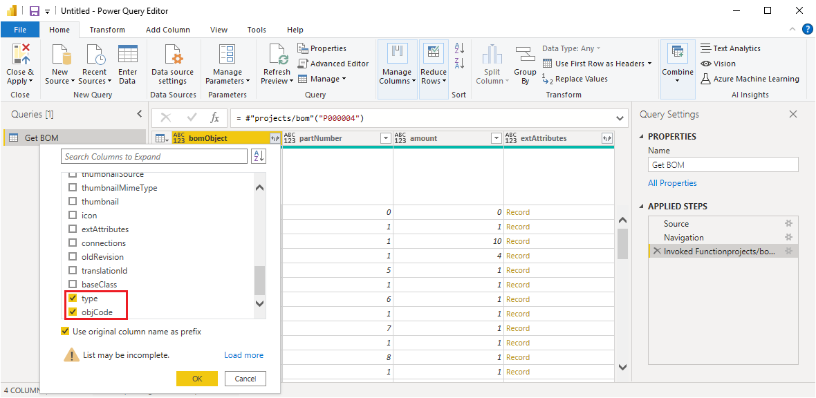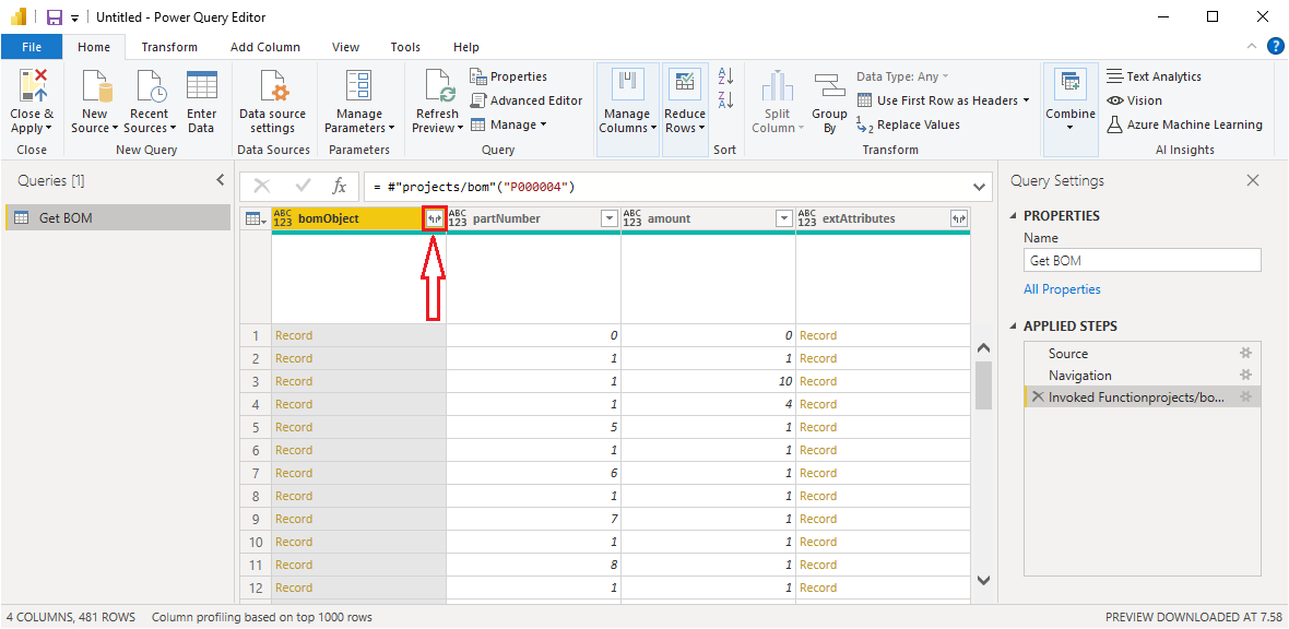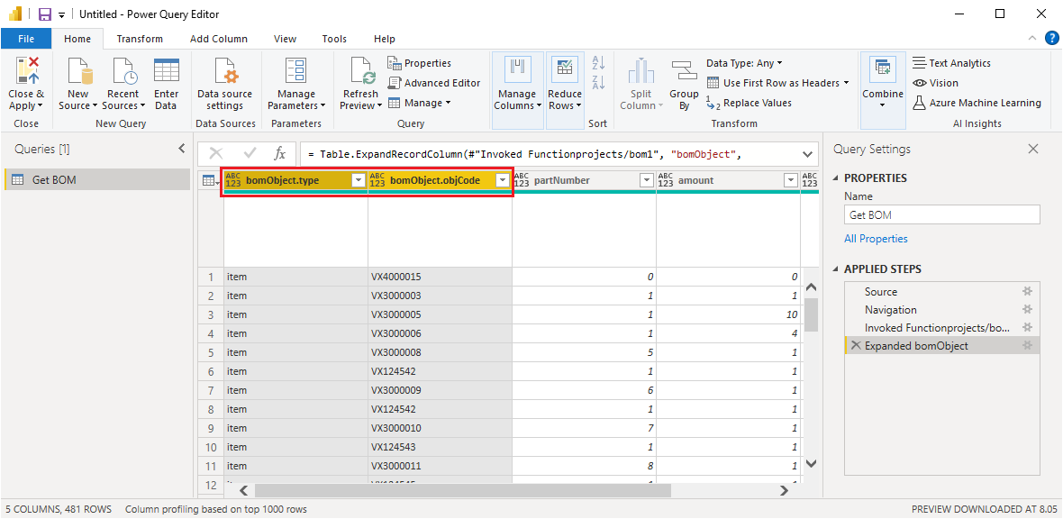 If there are unopened data structures, such as Record or List, in the data preview, you can open the data structures and get the data you want with Power BI's query editor by selecting Transform Data.