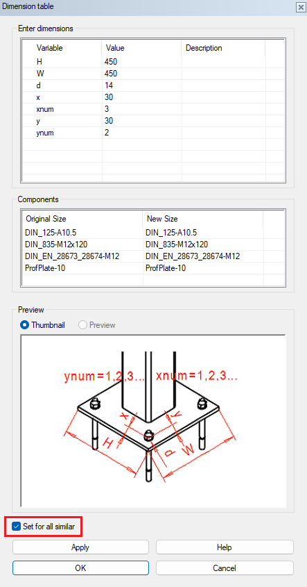 When editing a profile joint added to the assembly using the dimension table, you have the option Set for all similar. This option is available if there are other similar profile connections in the same assembly. When you enable this setting and exit the dimension table by clicking the OK button, the values will also be applied to other similar profile connections within the same assembly. In addition to the same assembly, the function also searches for similar profile connections in local sub-assemblies.
