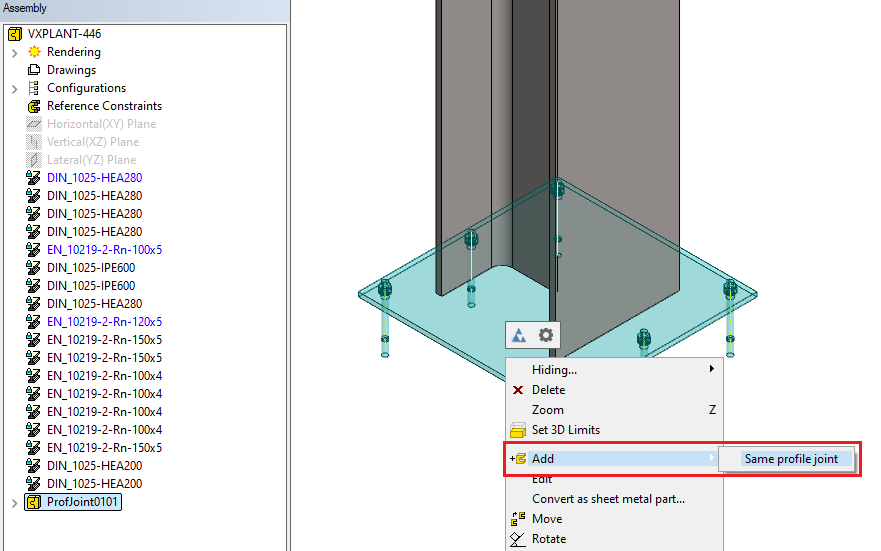 You can now select an existing profile joint in the assembly and initiate the action Add > Same profile joint from the context-sensitive menu. The program will then add a similar profile joint with the same dimensions as the selected one. (Vertex ID: VXPLANT-570)
