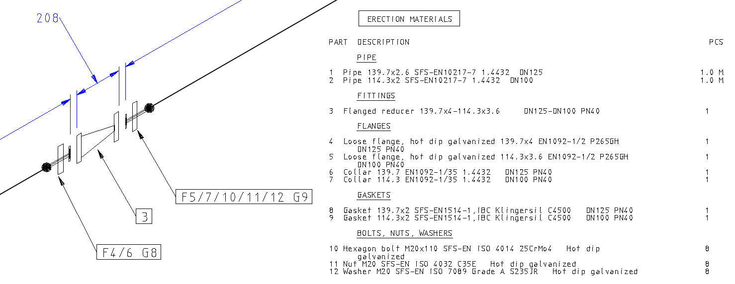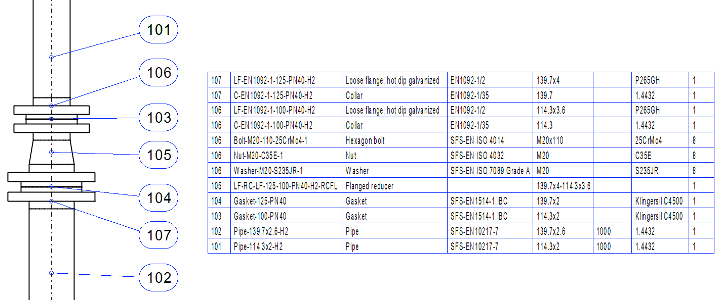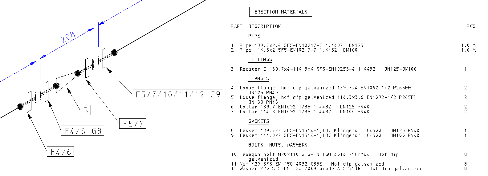 The type and class of the pipe assembly influence also to the pipe assembly's behavior in the parts list of the normal drawing and the Excel listings.