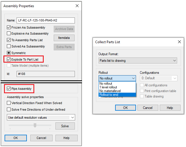 The window Assembly Properties contains the check-box Explode To Part List. Disable it if you want your pipe assembly yo behave in the same way in the parts list of normal drawing as it does in the isometric's parts list. The parts list will show only the mother row (part 105). The option Rollout to end does not have an impact on the parts list in this case.