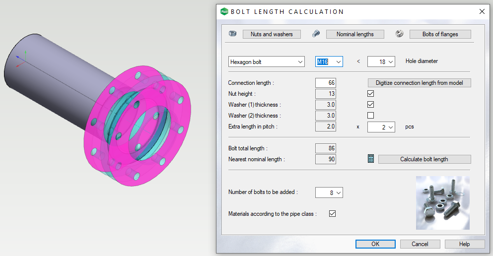 The program can insert semi-automatically required connection components to a flange pair with the help of the bolt surfaces. The connection components are not visible in the assembly. The program adds them to one of the flanges in the pair as un-modeled items.