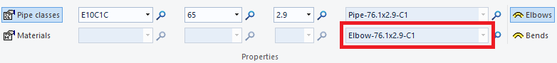 Specify the appropriate Class and Type for the pipe component elbow. The Class must be from the group Elbows and Bends.