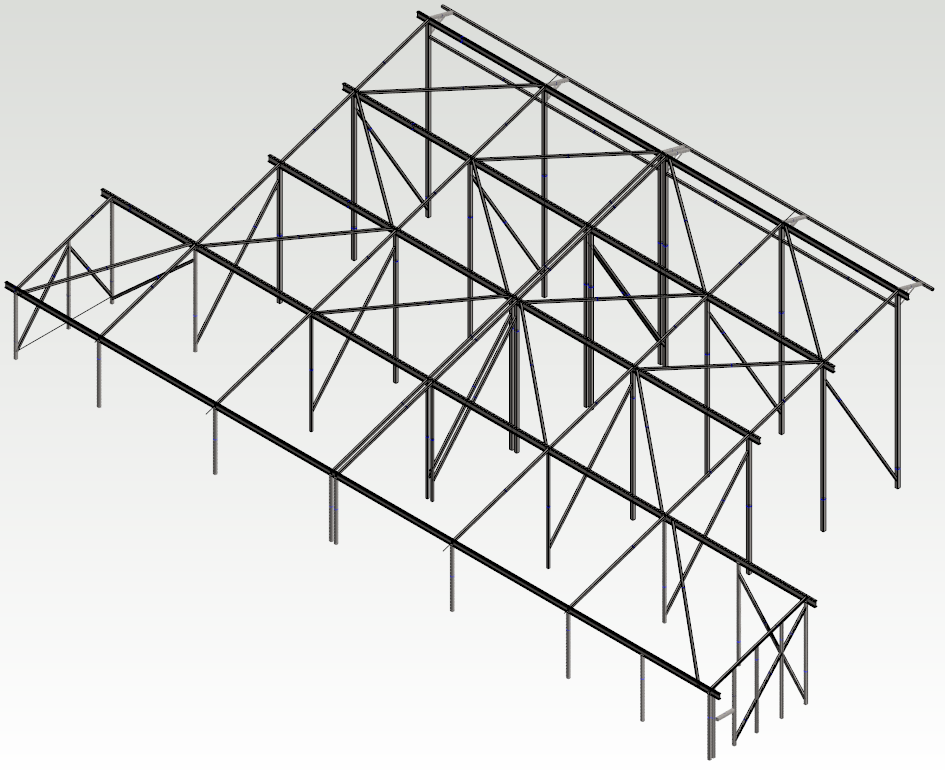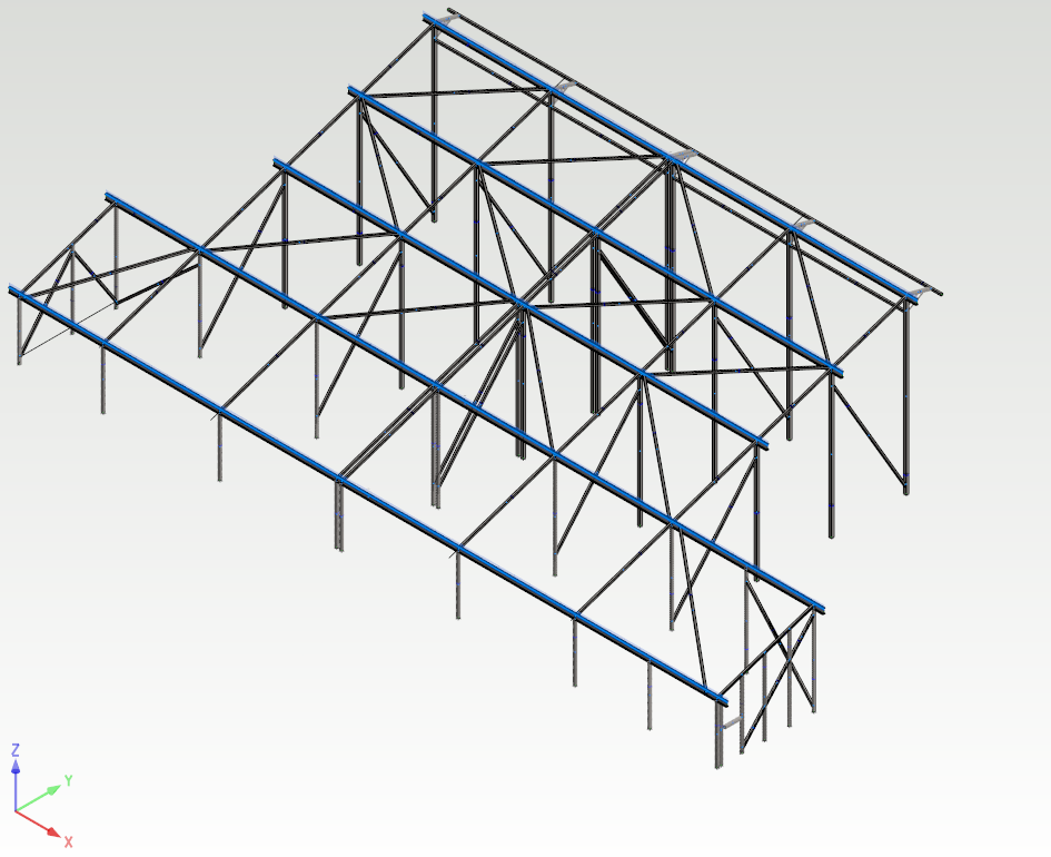 This example shows how to build a FEM analysis model for a steel structure illustrated in the figure below. The analysis model consists of beam elements. The bottom ends of studs will be fixed to the ground and I-beams are loaded with linear load. The self-weight of profiles is also taken into account.