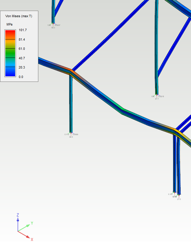 The stress plots of study members can be now examined. The results display can be selected as colored or diagram. The displacements of structure can be visualized by dragging Displacements slider. The support reactions of supported nodes are shown when Show support forces and Show support momentsare selected.