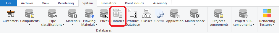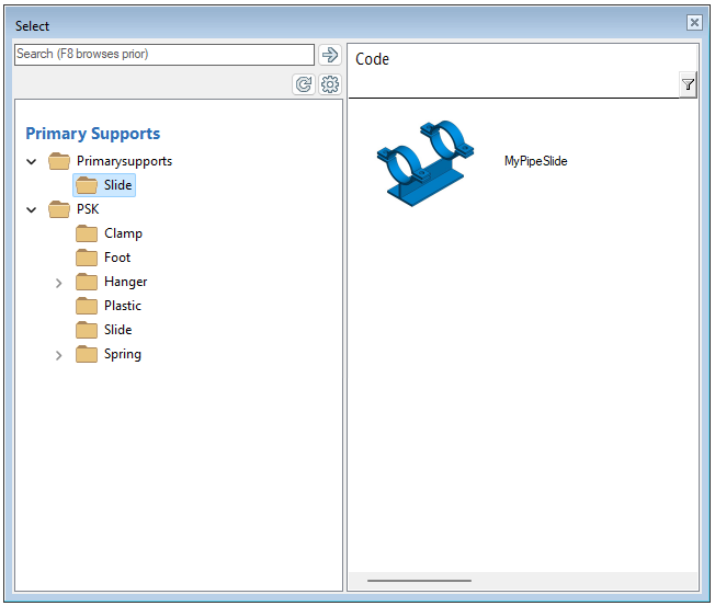 Adding primary supports starts from the same Add Primary Support button as before. The user must first digitize the pipe where to add the support. After this, the supports suitable for the selected pipe will be available for selection. With the new library technique, you can choose support from multiple libraries. By default, you are using the PSK library which contains new modeled supports. You can also activate the old, parameter-programmed library PSK_OLD. We added a Libraries button to the System tab to manage primary support libraries.