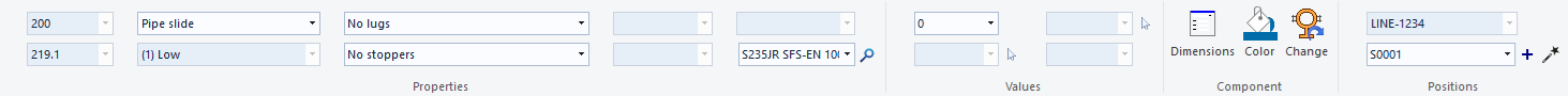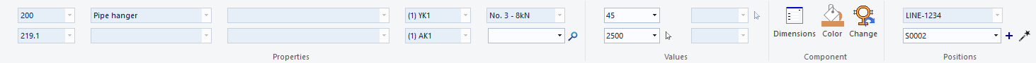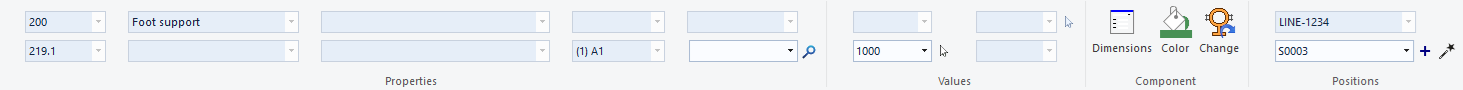 In the Component group, you can change the dimensions of the support using the dimension table (Dimensions), change the color of the support (Color), or change the type of the support (Change) during the addition.
