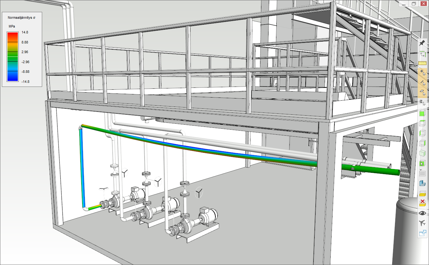 Pipelines can be analysed with external loads, the content of a pipe and thermal stresses. The analysis solves pipeline stresses, supports, deflections and support reactions. Even the pipeline is analyzed first with another software function. Prechecking reduces mistakes and speeds up the design process.