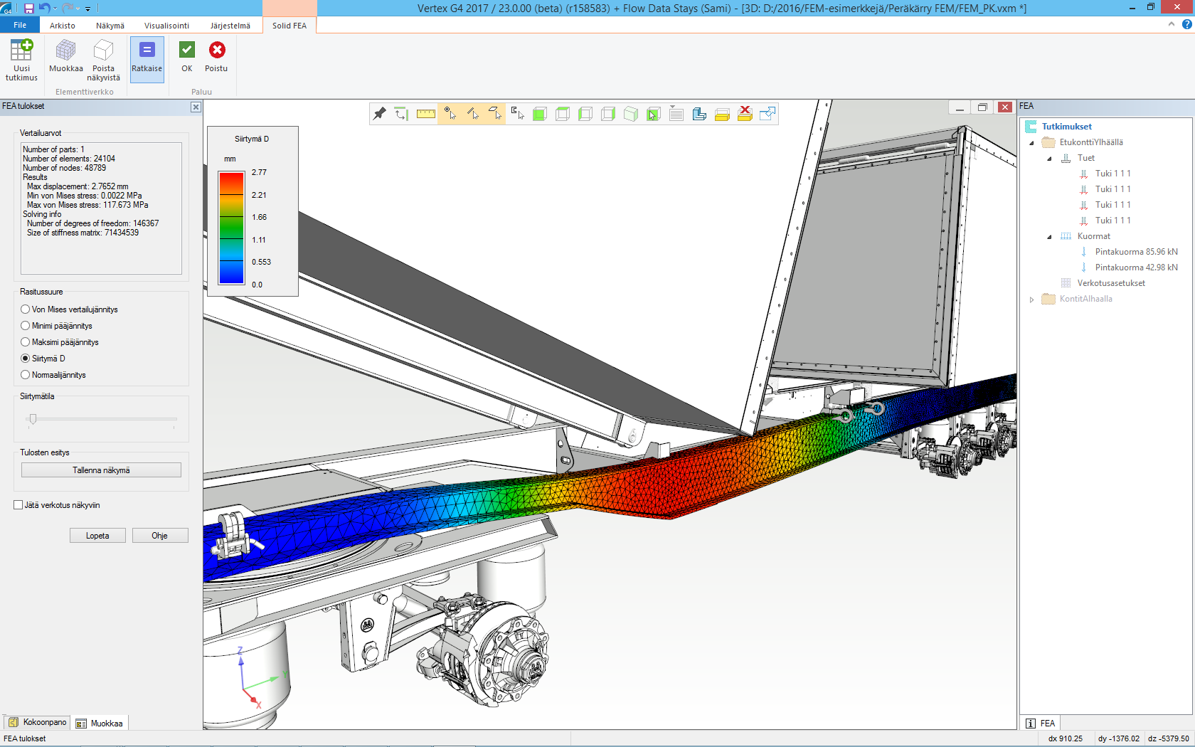 Vertex FEA modules are integrated in the heart of the Vertex software and are available for several products. New analysis studies can be created easily to referred geometry model and performed as linear statics analysis. Geometrical model supports multiple studies, so different kind of analysis situations can be modeled and modified easily.