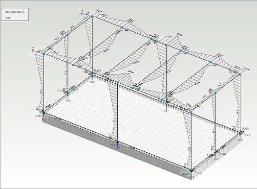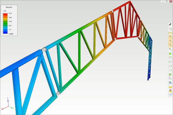 Profile structures can be analysed with FEA for Beams and Frames functionality. Analysis model is created from a geometric profile model and it supports widely different kinds of loads i.e. point, line and thermal loads. Results of the analysis shows visually in the model the common stress conditions such as deflection, bending moment, shear force and normal stress.
