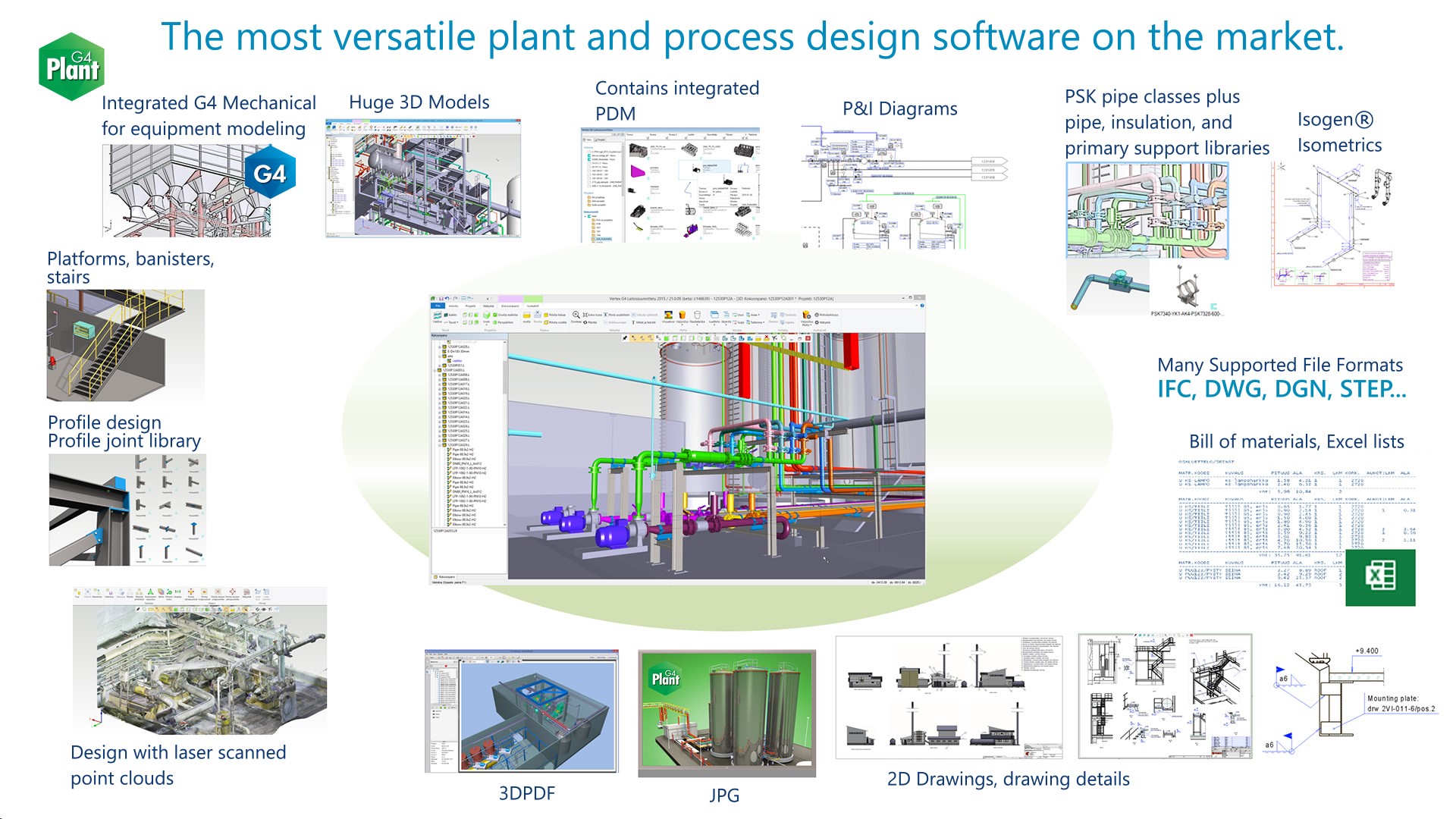 Vertex G4Plant has a support to many different 2D and 3D file formats. G4Plant includes also other connections to other software like bending machines and FEM software in addition to the traditional file formats.