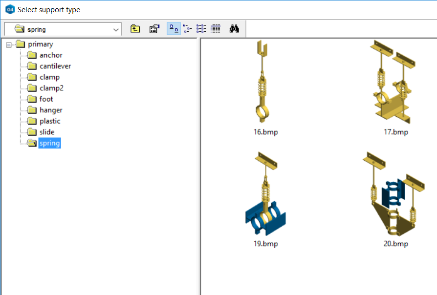 The program is delivered with the latest primary supports according to the standard PSK 73. The secondary support types console and gate are according to the standars SFS 5398 and SFS 5397. G4Plant has a special function to create support drawings. You have a possibility to add also Lisega and Hydra supports to your assembly.