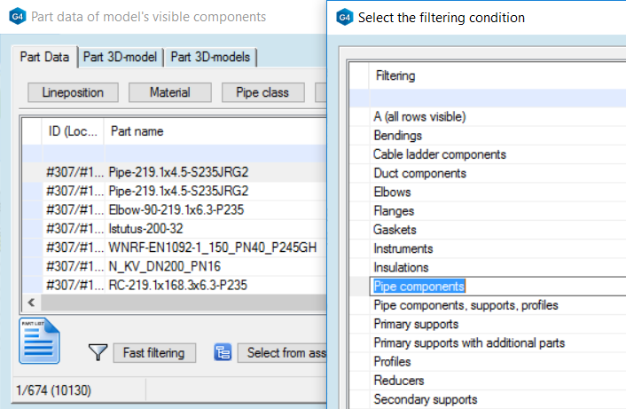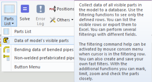 The data window contains various fast filtering options for example only pipe components, only support and only profiles are listed. The system includes several predefined Excel templates and one general neutral listing option. Export the parts list in Finnish or English.