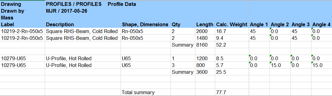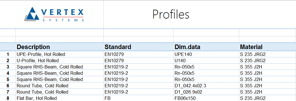 Generate cutting lists of profiles to Excel, text files or Vertex drawings with images. The Excel and text lists separate each profile type and size and define a weight of the profile and cutting angles at the end. The listing funtion summarizes the amount of each profile per meter and kilos. Link the existing profiles to your stock items' codes to get specified summary lists.