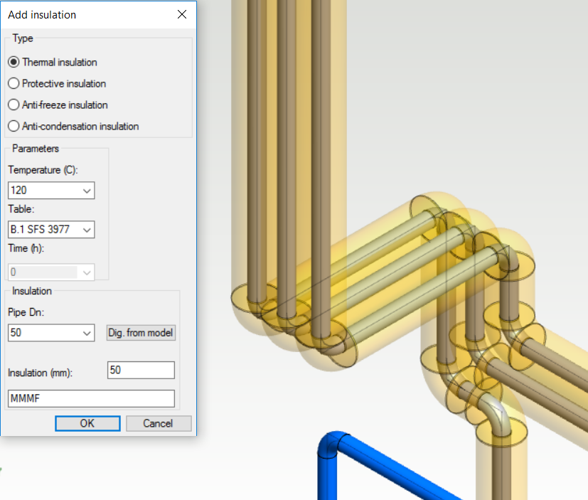 Add insulation to your pipe system with special functions. The insulation can be placed to whole pipeline or just to a section of the line. The special tools will help you to insulate elbows, flanges and equipment. You can adjust a visibility of the insulation by hiding them completely or set a value for transparency.