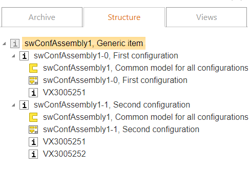 In this example assembly model defines 2 items: swConfAssembly1-0 and swConfAssembly1-1, where the first has one part VX3005251 and the second has two parts VX3005251 and VX3005252 in the Flow item structure. Both items have their own drawings.