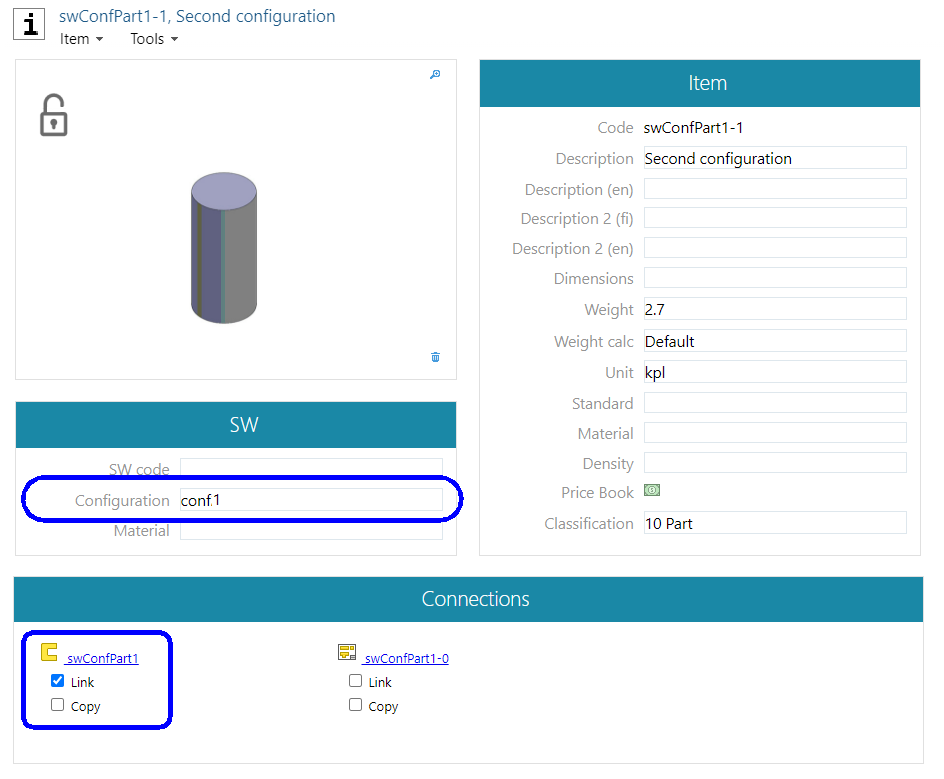 - link new item to drawing if all configurations have a common drawing: swConfPart1-0
