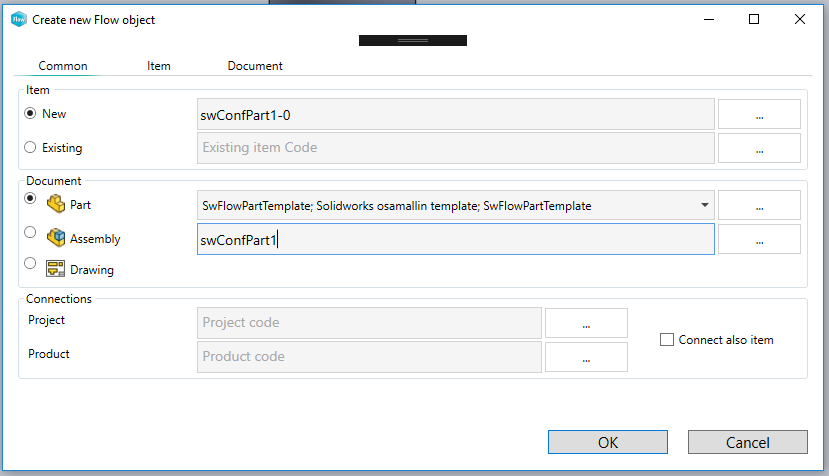 - create the first Flow variant item swConfPart1-0 and part model swConfPart1 with create a new Flow object function