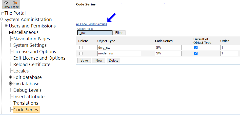 Below are the minimum code series settings for SolidWorks model and drawing. You can change the code settings page by clicking on the link indicated by the arrow.