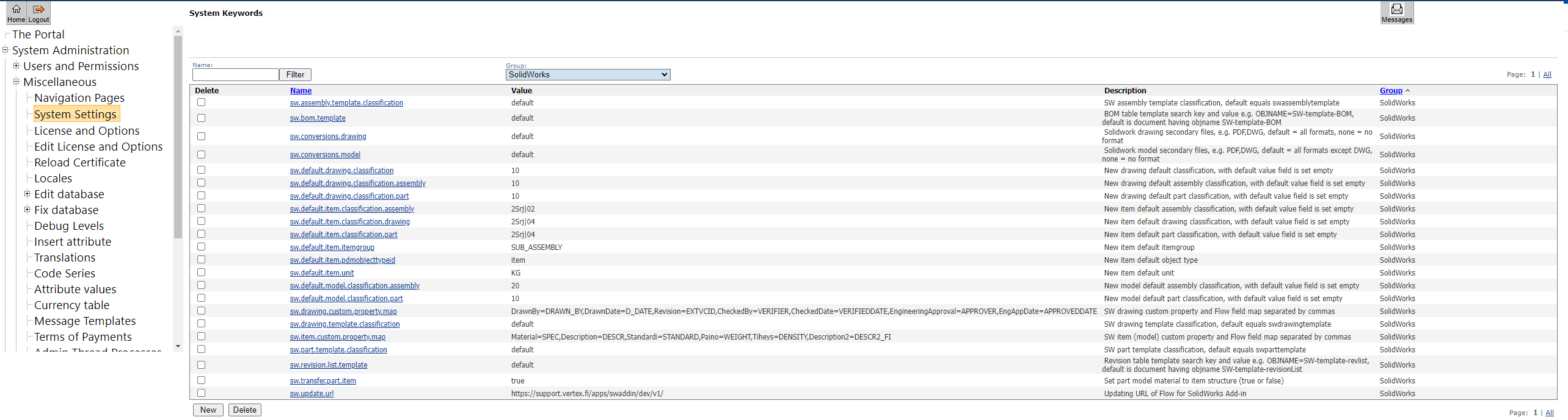 Flow administrator can change in Flow portal system setting keywords affecting Flow for SolidWorks operation. Keywords are described below.