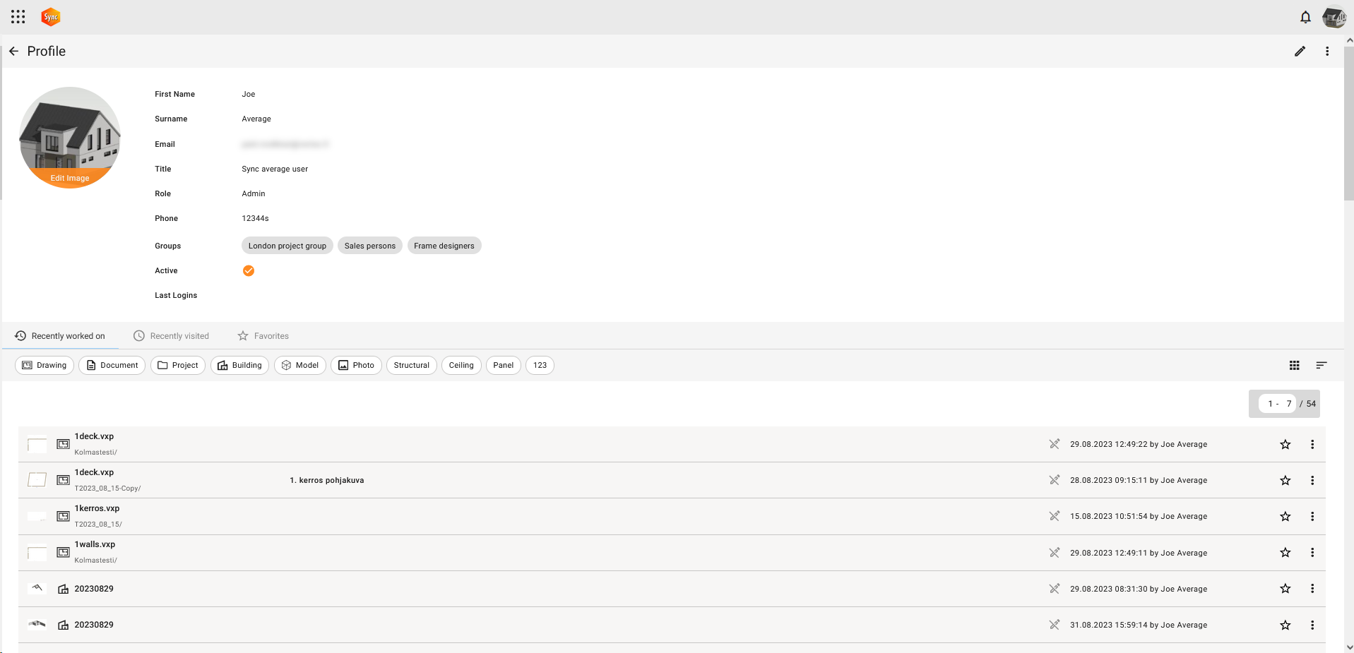 Your profile shows information like your email address, role, groups you belong to, the items you recently worked on or viewed and your favorite items. To view your profile and update your personal details, click your profile image at the right of the navigation and select My Account.